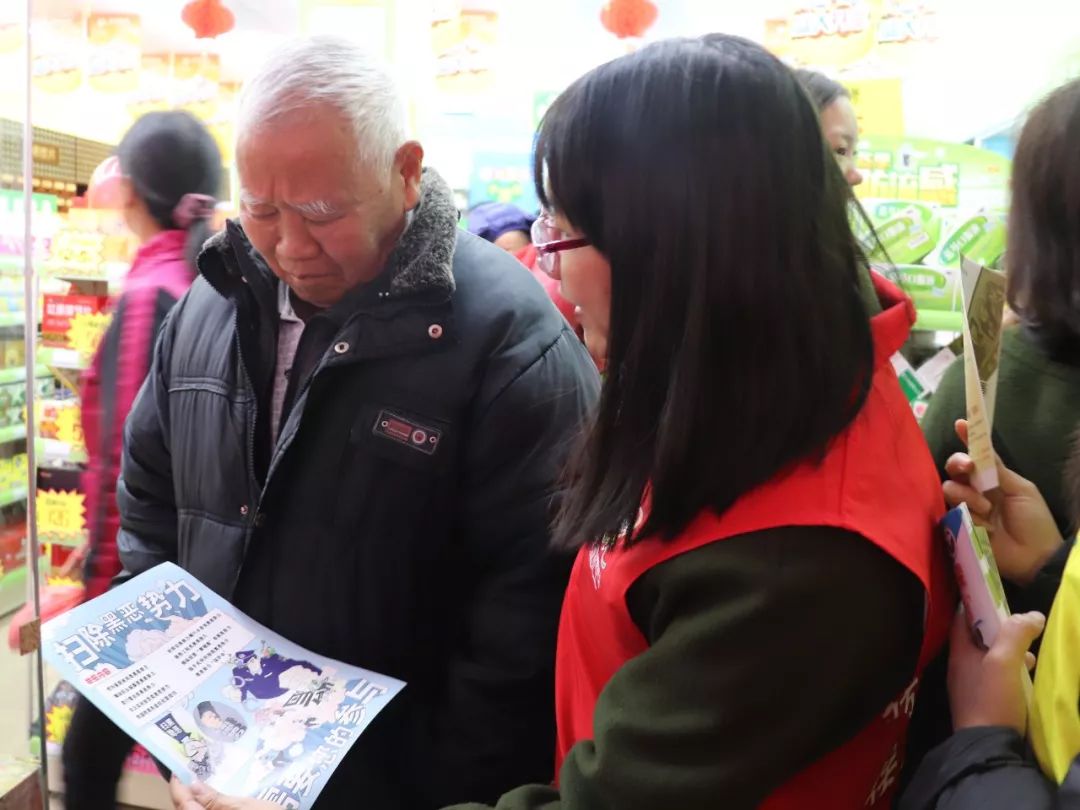 活动现场气氛活跃,群众在领取书法家现场创作春联的同时,工作人员和志愿者向群众进行扫黑除恶相关知识的宣传,宣传内容涵盖黑恶势力的十种类别、涉黑涉恶行为的主要特征、举报黑恶线索的方法以及相关法律问题等。为扩宽宣传辐射范围,工作人员和志愿者走上街头向群众发放扫黑除恶宣传资料,进一步凝聚社会扫黑除恶正能量。