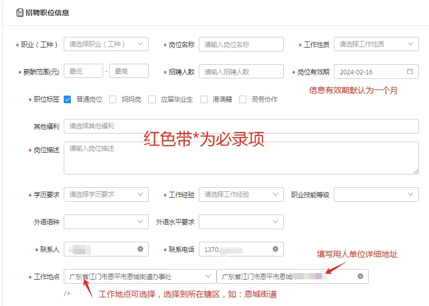 2.完善招聘职位信息,带*号的为必填项。可点击【保存】按钮保存职位信息,后续继续修改,也可点击【保存并发布】将该职位信息发布。