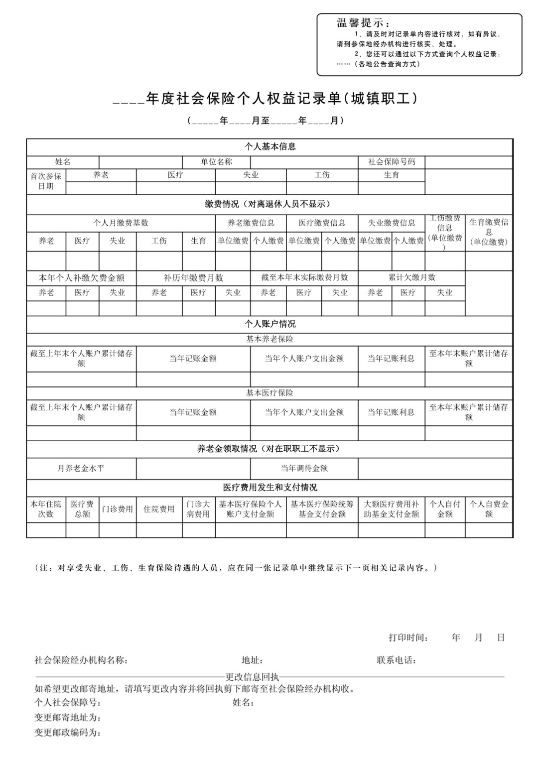 全国统一了社会保险个人权益记录单的基本格式,但需要说明的是,不同地区的权益记录单的样式和信息略有差别,这是正常的。对于不同的人群,比如城镇职工和城乡居民、在职人员和离退休人员,权益记录单也会根据您的实际情况有所不同。
