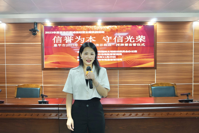活动最后,金豪雀服装店代表上台分享了“文明诚信示范店”创建工作经验,并表示十分荣幸能获得此份荣誉,在今后的经营中会坚持以诚信为本,依法依规经营,弘扬诚信精神,发挥好诚信示范的模范带头作用,提升产品和服务质量,及时有效处理消费者诉求,营造公平、舒畅、放心的消费环境。