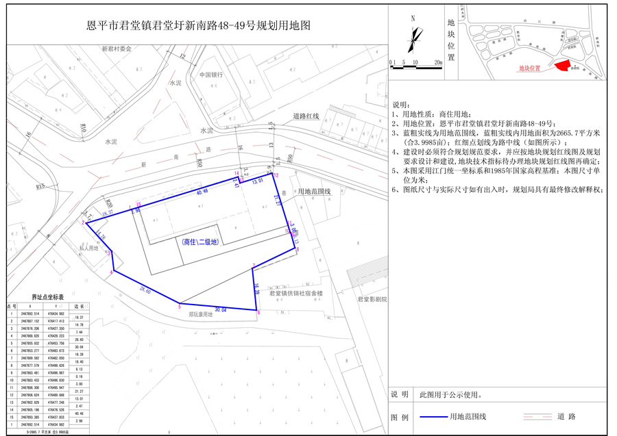 欧亚国际官网 君堂镇君堂圩新南路48-1号规划用地面积为197.2平方米(0.2959亩),用地性质为商住用地;欧亚国际官网 君堂镇君堂圩新南路48-2号规划用地面积为274.4平方米(0.4116亩),用地性质为商住用地;欧亚国际官网 君堂镇君堂圩新南路48-3号规划用地面积为241.8平方米(0.3626亩),用地性质为商住用地;欧亚国际官网 君堂镇君堂圩新南路地块规划用地面积为946.4平方米(1.4195亩),用地性质为商服用地;欧亚国际官网 君堂镇君堂圩新南路48-49号规划用地面积为1005.9平方米(1.5089亩),用地性质为商住用地。现开发单位要求把该五地块合并为一块用地,合并后总用地面积为2665.7平方米(3.9985亩),用地性质为商住用地,统一编排地址为欧亚国际官网 君堂镇君堂圩新南路48-49号。经审核,该五地块合并为一块用地,用地性质为商住用地,符合《欧亚国际官网 君堂镇镇区总体规划(2009-2028)》的规划要求,现给予公示。