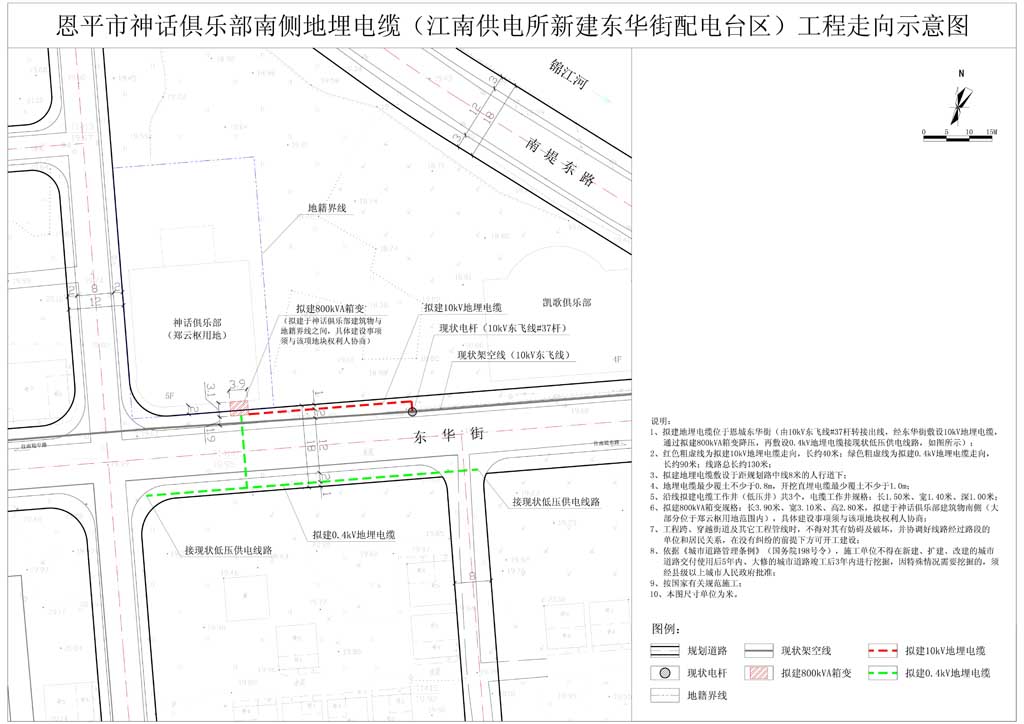 该项目位于恩城东华街(由10kV东飞线#37杆转接出线,经东华街敷设10kV地埋电缆,通过拟建800kVA箱变降压,再敷设0.4kV地埋电缆接现状低压供电线路。拟建电缆线路总长约130米,其中:拟建10kV地埋电缆约40米,拟建0.4kV地埋电缆约90米。沿线拟建电缆工作井(低压井)共3个,电缆工作井规格:长:1.50米,宽1.40米,深1.00米;拟建800kVA箱变规格:长3.90米、宽3.10米、高2.80米,拟建于神话俱乐部建筑物南侧(大部分位于郑云枢用地范围内),具体建设事项须由建设单位与该地块权利人协商,经同意后方可开工建设(如图所示)。