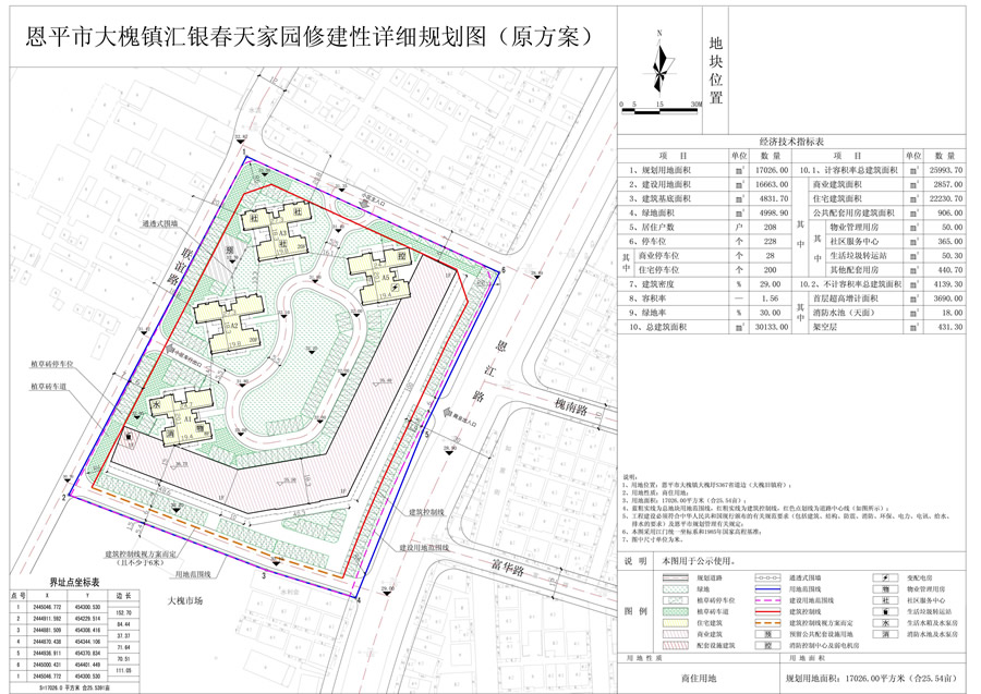 该地块位于欧亚国际官网 大槐镇大槐圩S367省道边(大槐旧镇政府),规划用地性质为商住用地,规划用地面积为17026.00平方米(合25.5391亩),建设用地面积为16663.00平方米。原规划方案建筑布局主要为1层的商业裙楼及4栋一梯四户、8-20层的住宅楼,主要经济技术指标:总建筑面积为30133.00平方米(其中:计容积率建筑面积为25993.70平方米,不计容积率建筑面积4139.30平方米),建筑基底面积为4831.70平方米,建筑密度为29.00%,容积率为1.56,绿地率为30.00%,居住户数为208户,停车位228个(详见附图)。