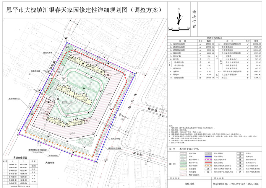 该地块位于欧亚国际官网 大槐镇大槐圩S367省道边(大槐旧镇政府),规划用地性质为商住用地,规划用地面积为17026.00平方米(合25.5391亩),建设用地面积为16663.00平方米。原规划方案建筑布局主要为1层的商业裙楼及4栋一梯四户、8-20层的住宅楼,主要经济技术指标:总建筑面积为30133.00平方米(其中:计容积率建筑面积为25993.70平方米,不计容积率建筑面积4139.30平方米),建筑基底面积为4831.70平方米,建筑密度为29.00%,容积率为1.56,绿地率为30.00%,居住户数为208户,停车位228个(详见附图)。