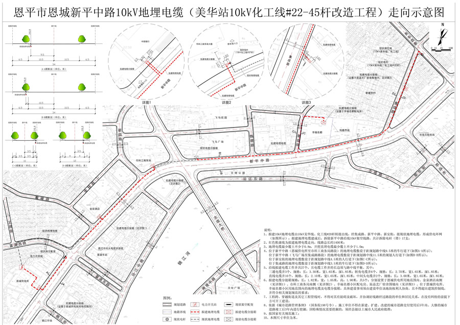 该项目位于恩城集成路、新平中路、新安街。拟建10kV地埋电缆由10kV美华线、化工线#20杆转接出线,经集成路、新平中路、新安街,接现状地埋电缆,形成供电环网,拟建地埋电缆建成后,拆除新平中路沿线10kV架空线路,共计拆除电杆(塔)17支。线路总长约1400米。沿线拟建电缆工作井共27个,且电缆工作井的长边须与路中线平衡。其中:三通电缆井3个,规格:长:3.30米,宽1.65米,深1.85米;转角电缆井6个,规格:长:2.70米,宽1.65米,深1.85米;直线电缆井16个,规格:长:2.10米,宽1.65米,深1.85米;中间头电缆井2个,规格:长:3.00米,宽1.65米,深1.85米。拟建电缆分接箱规格:长:1.82米,宽:1.05米,高:1.90米,共5个;分别设置于恩城供电所用地范围内、金泉酒店南侧、市科工商务局南侧、幸福名都小区配电房、原晶艺厂宿舍围墙内,位于恩城供电所、幸福名都小区用地范围内的地埋电缆及电缆分接箱,具体建设事项须由建设单位该地块权利人协商,且不得超出建筑控制线,并符合相关规划规范的要求(如图所示);现给予公示。