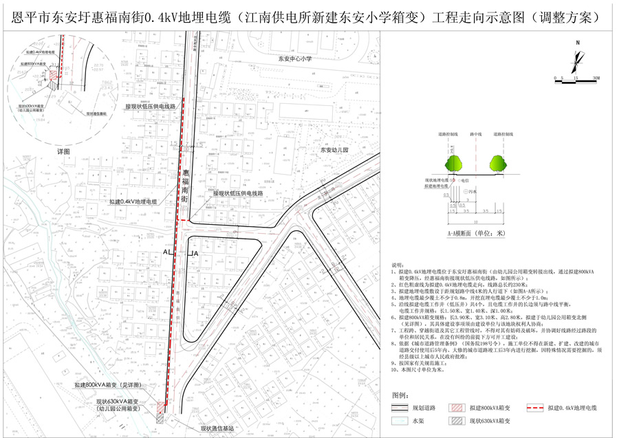 该项目位于东安圩惠福南街。原方案由10kV东安线圩镇支线#6杆转接出线,经惠福南街接入东安中心小学拟建800kVA箱变。拟建地埋电缆总长约150米,沿线拟建电缆工作井(高压井)共2个,规格:长3.00米、宽1.40米、深1.00米,且电缆工作井的长边须与路中线平衡。拟建800kVA箱变规格:长3.90米、宽3.10米、高2.80米,共1个,拟建于东安中心小学用地范围内(如图所示)。