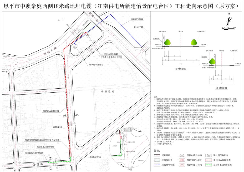 该项目位于东安圩英贤街。原方案位由中澳公用电缆分接箱转接出线,经其北侧现状绿化带、中澳豪庭西侧18米路接入拟建电缆分接箱转接,通过拟建800kVA箱变降压后,经英贤街敷设0.4kV地埋电缆接现状低压供电线路(如图所示);