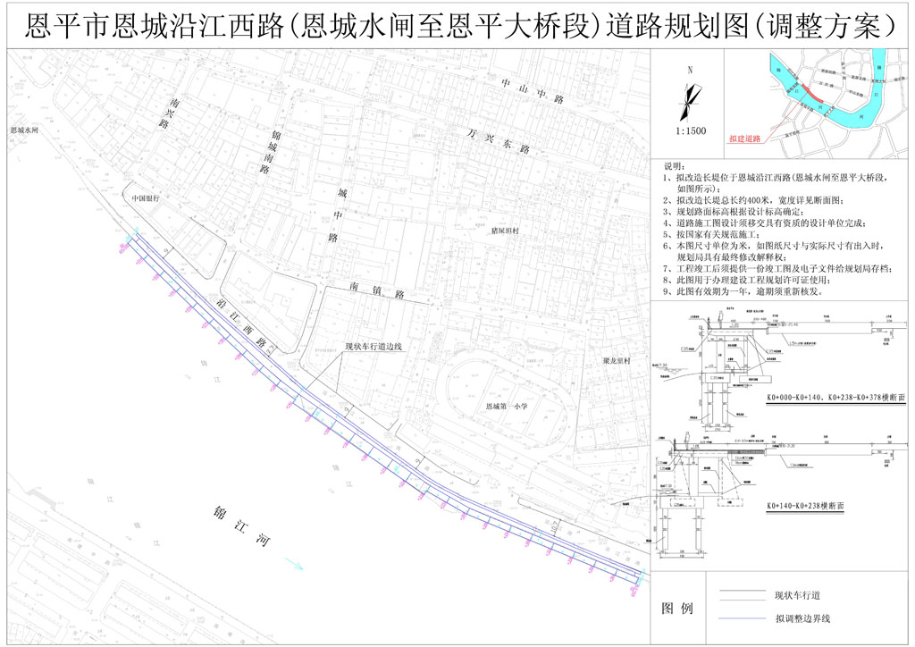 中心城区沿江西路长堤(恩城水闸至欧亚国际大桥段)。该项目于2013年10月取得建设工程规划许可证,由于原工程方案亲水平台离水面较低且该部分长堤出现裂缝,存在一定的安全隐患,故建设单位申请对亲水平台的高度及向外飘出的宽度进行调整,由于该段道路呈弯形走向,道路的宽度分两段进行调整,原规划亲水平台及道路横断面宽度为3+(2~4.8)+1.5+9+3.5米,现作如下调整: