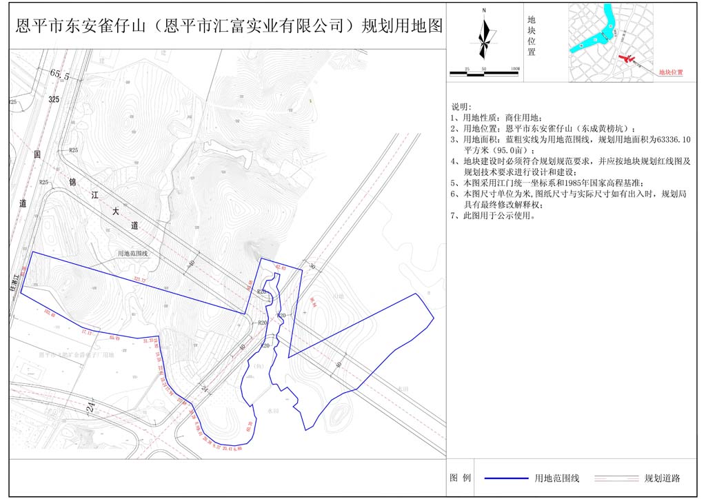 东安雀仔山(东成黄榜坑),于2009年已办理国土证[国土证号:恩府国用(2009)第01763号],规划用地面积为63336.10平方米(95.0亩)。用地性质为商住用地。现开发单位因实际发展需求和根据恩府办函[2016]440号文件要求以及市国土资源局测绘队提供的新宗地图,申请调整用地范围线,调整后位于欧亚国际官网