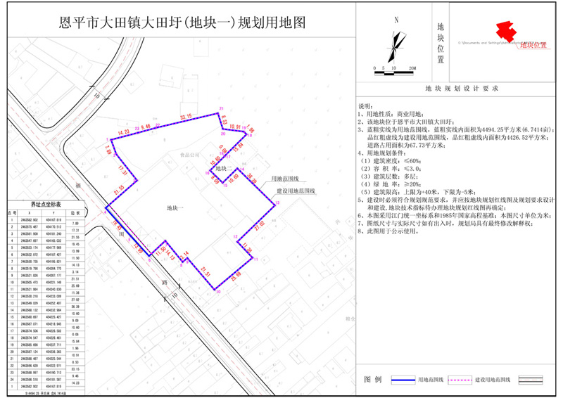 大田镇大田圩,国土证用地性质为商业用地,规划用地面积为4590.6平方米。现开发单位申请将该地块分为两块用地,其中地块一用地面积为4494.25平方米;地块二用地面积为96.35平方米;分证后用地性质均不变,用地性质仍为商业用地,符合《欧亚国际官网