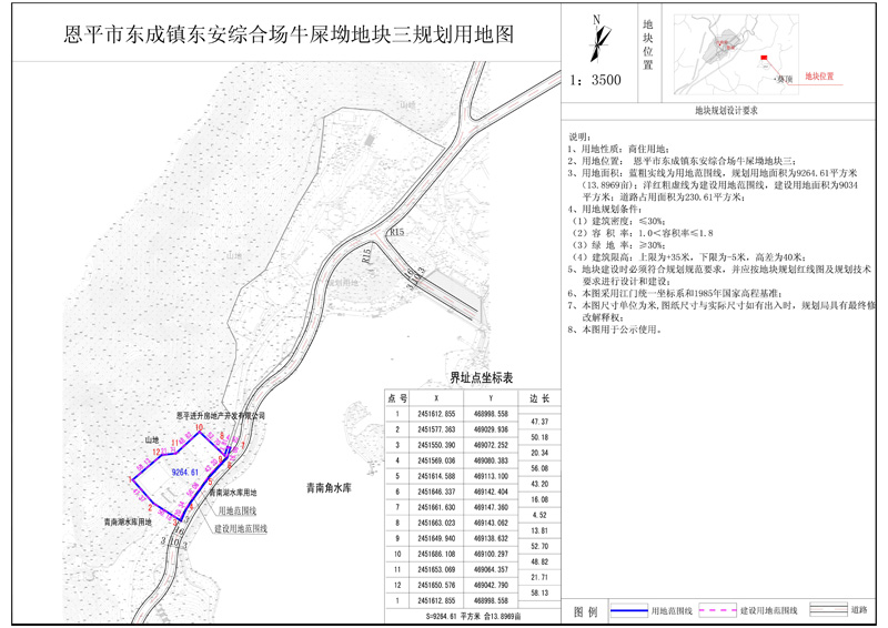 东成镇东安综合场牛屎坳,不动产权证用地性质为商住用地,规划用地面积为60003.2平方米。现开发单位因土地开发及方便设计方案规范化,申请将该地块分为三块用地,其中地块一用地面积为33722.06平方米;地块二用地面积为17016.53平方米;地块三用地面积为9264.61平方米;分证后用地性质均不变,用地性质仍为商住用地,现给予公示。