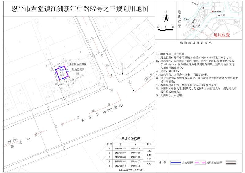 君堂镇江洲新江中路(325国道)57号,用地性质为商住用地,用地面积为240.0平方米(0.3600亩)。现开发单位申请将该地块分为三块用地,其中57号之一用地面积为112.0平方米(0.1680亩);57号之二用地面积为80.0平方米(0.1200亩);57号之三用地面积为48.0平方米(0.0720亩);分证后用地性质均不变,用地性质仍为商住用地。符合《欧亚国际官网