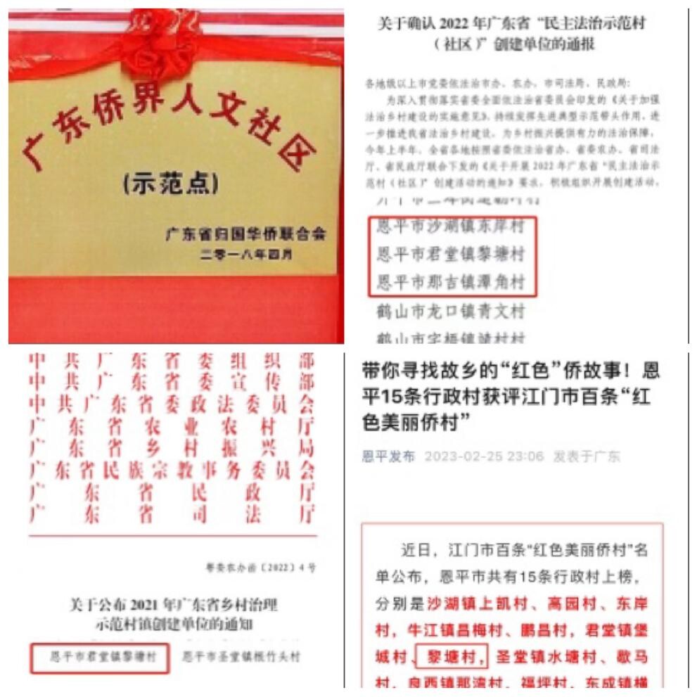 乡村振兴,既要“塑形”,更要“铸魂”。黎塘村以提升乡风文明为重点,着力在文化引领方面下功夫。一是打造乡风文明宣传新阵地,以建设张瑞芬纪念馆为契机,把航天爱国英雄张瑞芬的奋斗事迹及精神转化为属于黎塘人自己的“黎塘精神”谱系,引导广大村民弘扬优良传统,传承“黎塘精神”。二是用好用活黎塘村史馆这一本土资源,注重挖掘本地丰富人文历史内涵,用老物件、旧照片,传递老一辈侨胞们吃苦奋斗的精神和勤俭持家的家风,引导群众弘扬优良传统和民俗家风,促进乡风文明、留住乡愁乡情。三是精心举办“星级文明户”“最美家庭”等评选活动,充分调动广大村民参与文明村建设的积极性,使村民在自我教育、自我评价中享受到精神文明建设的成果,进一步营造爱国爱家、老少同乐、向上向善的文明新风尚。此外,该村在乡村振兴的路上真正做到走在前列,先后获得“广东省侨界人文社区示范点”“广东省民主法治示范村(社区)”“广东省乡村治理‘百镇千村’示范村”“江门市乡村旅游示范点”“江门市百条‘红色美丽侨村’”等荣誉称号。
