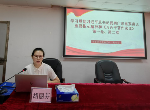 7月28日,市自然资源局开展学习贯彻习近平总书记视察广东重要讲话重要指示精神和《习近平著作选读》第一卷、第二卷宣讲会,局党组成员、副局长陈添法主持会议,市委宣讲团成员胡丽芬进行授课,局中层以上干部及党员干部约60人参会。