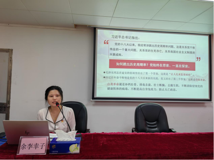 宣讲会上,余李幸子老师从“党的自我革命的提出和发展、新时代党的自我革命的主要经验、新征程推进党的自我革命的方向路径”三个方向阐述了党的自我革命的历史由来、坚持自我革命的原因以及丰富的历史经验,引导党员干部在新征程推进党的自我革命应从“坚决维护党中央权威和集中统一领导、加强思想建设,坚持用习近平新时代中国特色社会主义思想凝心铸魂、秉承优良作风,强化责任担当、严明党纪法规,坚守为政底线、坚决打赢反腐败斗争攻坚战持久战”等五个方面持续发力,久久为功。