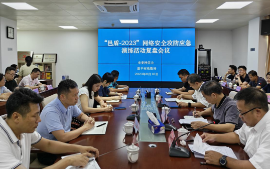“邑盾-2023”网络安全攻防应急演练活动复盘会议,市纪委监委、市委政法委、市公安局等相关单位以及各镇(街)首席数据官或分管领导参加会议。
