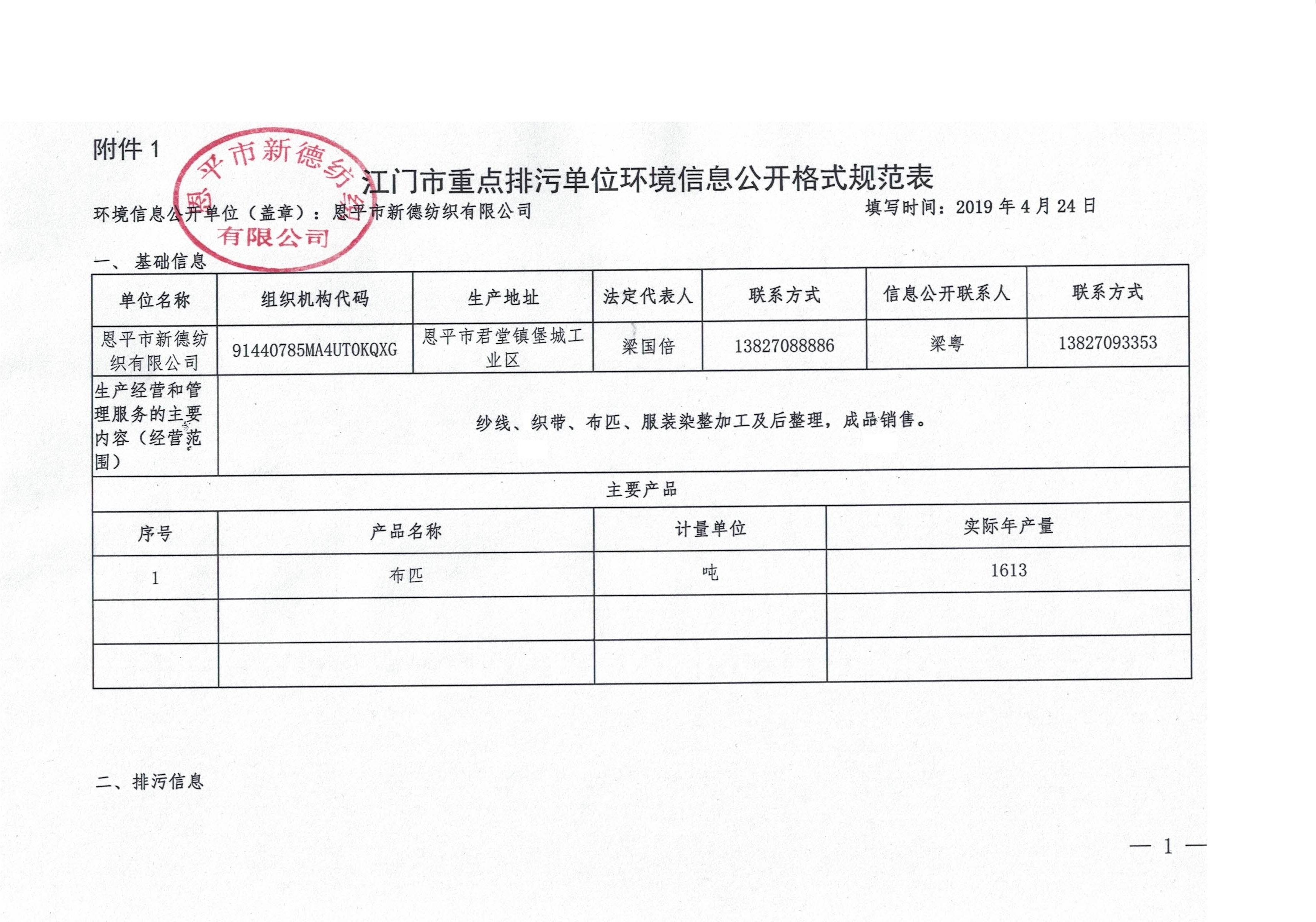| 企业名称 | 欧亚国际官网 新德纺织有限公司 | 排污许可证号 | 91440785MA4UT0KQXG001P |