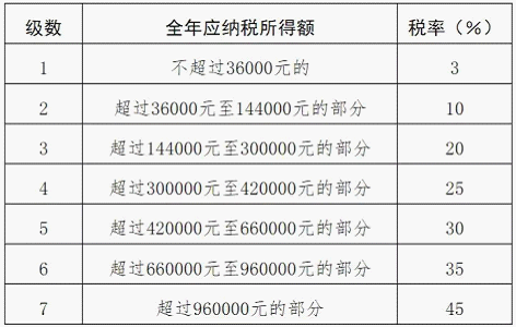 注2:非居民个人取得工资、薪金所得,劳务报酬所得,稿酬所得和特许权使用费所得,依照本表按月换算后计算应纳税额。)