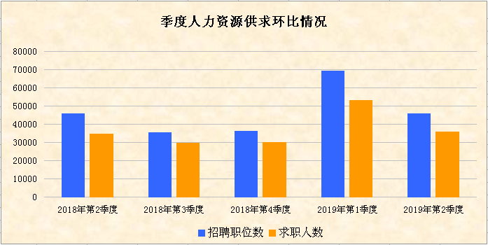 第二季度,我市企业招聘职位数为45884个,比上季度减少了23470个,环比下降33.84%;求职人数为35930人,比上季度减少17282人,环比下降32.48%。全市各类企业用工在经历了第一季度的自然流动和补充后春节后企业的招工潮及异地务工人员的返工潮,第二季度招聘职位和求职人数比上季度均有不同程度的下降,人力资源供求规模整体在缩减。与2018年第二季度相比,我市人力资源市场供求规模轻微增大,其中招聘职位数同比增加203个,上升0.44%,求职人数同比增加1475人,上升4.28%。