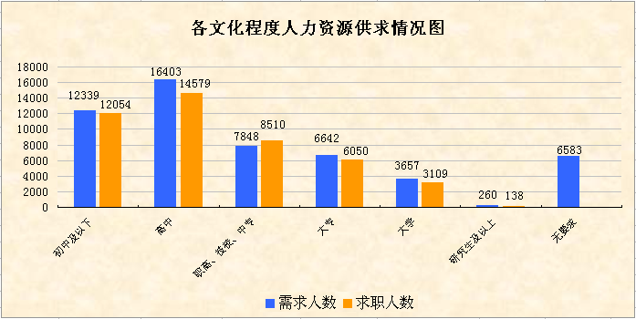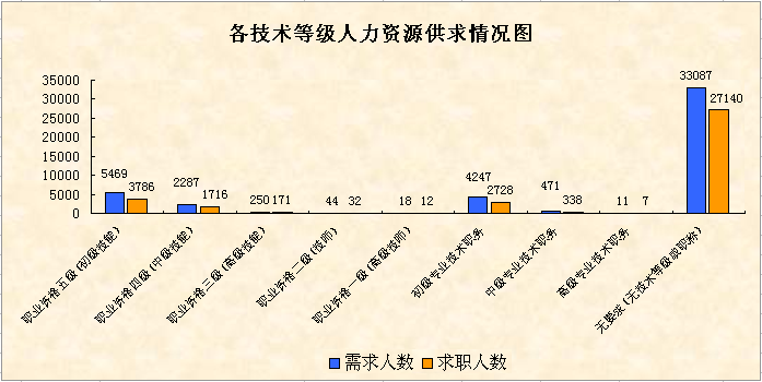 第二季度,从企业用工及人力资源服务平台信息系统和全市人力资源服务机构的数据统计,全市用人单位登记招聘职位数共45884个,登记求职人数共35930人,总体职位供求比为1:0.78(招聘职位数为1,求职人数为 0.78,下同);全市人力资源市场总体用工缺口为9954人。