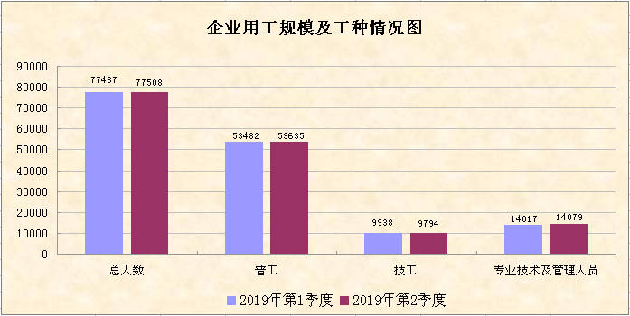 企业第二季度的在岗员工数量为77508人,仅增加了71人,与上季度基本持平。其中,普工53635人,占69.20%,环比增加0.29%;技工9794人,占12.64%,环比减少1.45%;专业技术及管理人员14079人,占18.16%,环比增加0.44%。