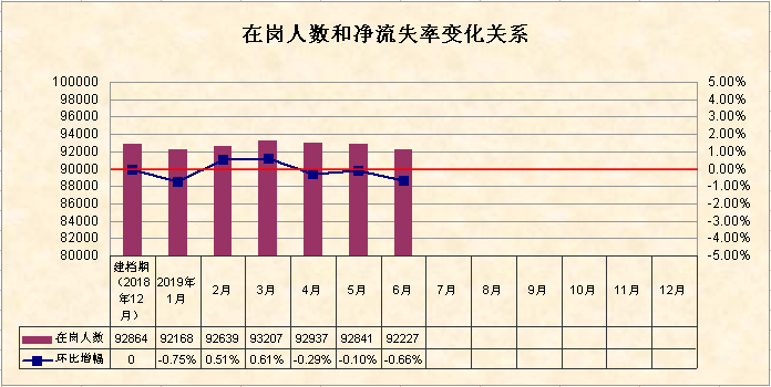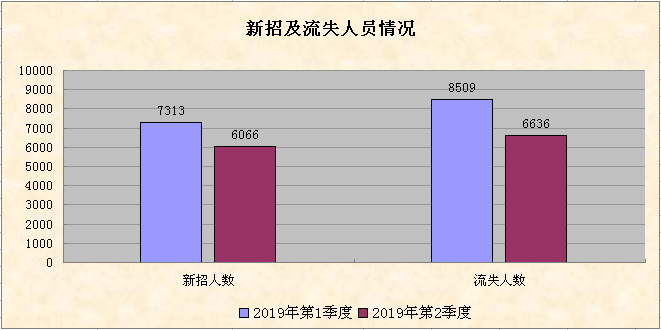 企业第二季度新招员工6066人,比上季度减少1247人,环比减少17.05%;第二季度流失员工6636人,比上季度减少1873人,环比减少22.01%;新招员工与流失员工的比值为0.91,比上季度的0.86增加0.05,流失人数多于新招人数,净流失570人,与上季度净流失的1196人相比大幅减少,反映企业的用工稳定性较上季度略有好转。