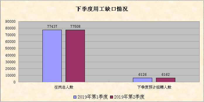 根据上述图表,从企业连续2个季度的数据分析,2019年第一季度预计2019第二季度招聘人数为6126人,实际招聘到6066人,反映企业第二季度通过各类招聘渠道补员后基本能满足预计的用工需求;而从2019年第二季度刚上报的监测数据来看,企业预计在第三季度计划新招6162人,用工需求与第二季度基本持平,反映企业主要以满足正常人员流失的补员为主,对新增用工的需求不强烈,比较保守。