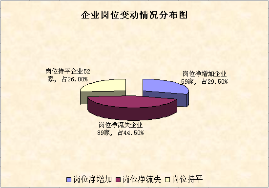 6月末全市监测企业发生岗位数量环比净增加的有59家,占29.5%,共增加岗位471个,环比增加1.63%;岗位数量环比净流失的有89家,占44.5%,共减少岗位1085个,环比减少2.11%;岗位数量保持不变的有52家,占26%。