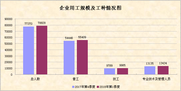 企业2018年第一季度的在岗员工数量为78828人,比上季度增加了1458人,增幅1.88%。其中,普工55409人,占70.29%,环比增加1.77%;技工9985人,占12.67%,环比增加2%;专业技术及管理人员13434人,占17.04%,环比增加2.28%。