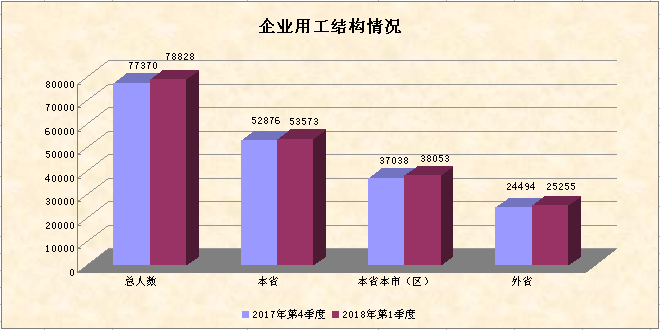 企业2018年第一季度的在岗员工中,本省员工有53573人,占67.96%,环比增加1.32%;本省本市(区)员工有38053人,占总人数的48.27%,环比增加2.74%;外省员工有25255人,占32.04%,环比增加3.11%。
