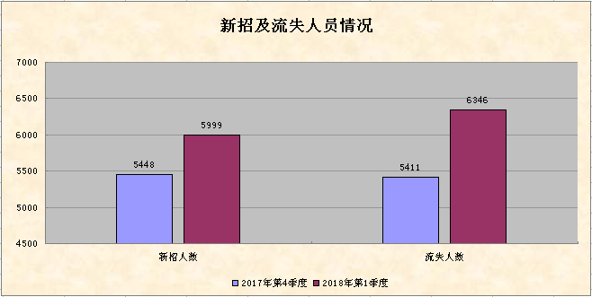 企业2018年第一季度新招员工有5999人,比2017年第四季度增加551人,环比增加10.11%;第一季度流失员工有6346人,比2017年第四季度增加935人,人员流失总量环比增加17.28%;新招员工与流失员工的比值为0.95,比上季度的1.01减少了0.06,出现流失人数多于新招人数,净流失347人,受春节前后返乡、节后跳槽现象增多等因素影响,用工稳定性较上季度低,但净用工缺口不大,总体就业相对稳定。