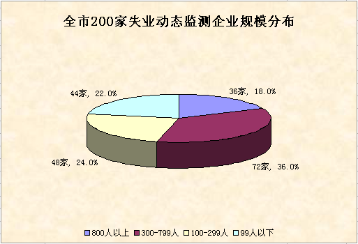 3月末全市失业动态监测共有200家企业,从监测企业规模结构看,用工规模在800人以上的有36家,占18%;300至799人的有72家,占36%;100至299人的有48家,占24%;99人以下的有44家,占22%。