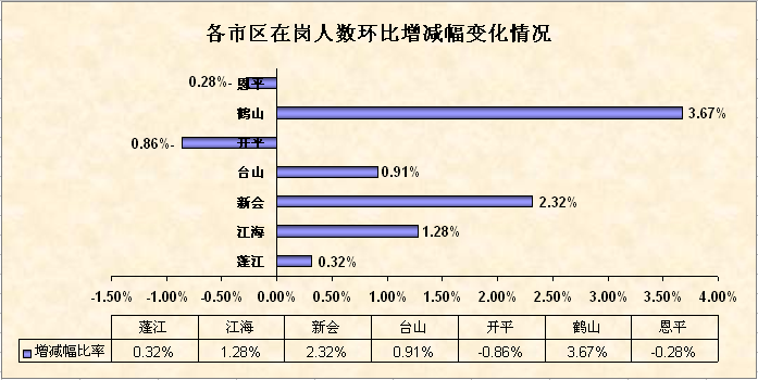 3月末各市(区)监测企业的岗位出现不同程度的变动,其中鹤山市和新会区在岗人数环比增幅最大,分别为3.67%和2.32%,而开平市和欧亚国际官网 则环比减少0.86%和0.28%,在岗人数出现净流失。
