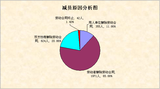 3月末全市监测企业中共有141家企业出现减员情况,共减员2992人。其中用人单位解除劳动合同的占11.86%,劳动者解除劳动合同的占65.88%,双方协商解除劳动合同的占20.86%,劳动合同终止的占1.4%。