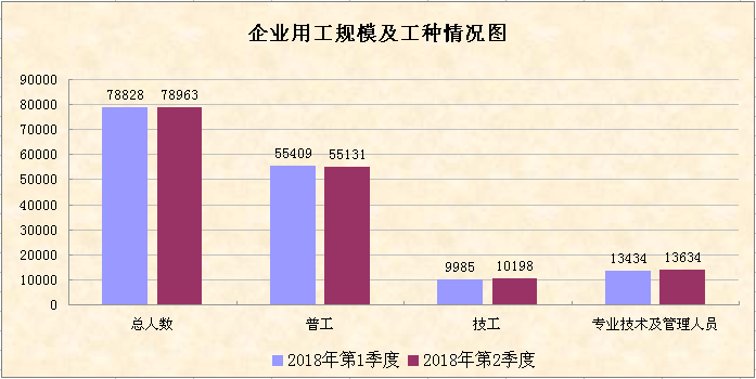企业第二季度的在岗员工数量为78963人,比上季度仅增加了135人,增幅为0.17%,与上季度基本持平。其中,普工55131人,占69.82%,环比减少0.5%;技工10198人,占12.91%,环比增加2.13%;专业技术及管理人员13634人,占17.27%,环比增加1.49%。