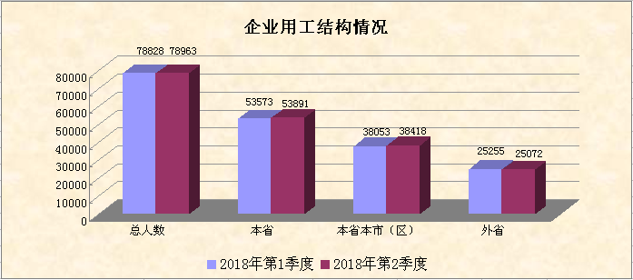 企业第二季度的在岗员工中,本省员工有53891人,占68.25%,环比增加0.59%;本省本市(区)员工有38418人,占总人数的48.65%,环比增加0.96%;外省员工有25072人,占31.75%,环比减少0.72%。