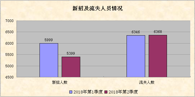 企业第二季度新招员工5399人,比上季度减少600人,环比减少10%;第二季度流失员工6368人,比上季度增加22人,环比增加0.35%;新招员工与流失员工的比值为0.85,比上季度的0.95减少了0.1,出现流失人数多于新招人数,净流失969人,用工稳定性较上季度低。