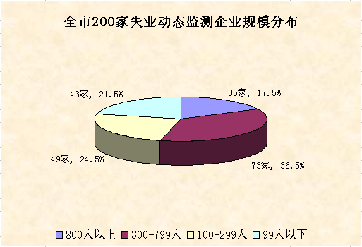 6月末全市失业动态监测共有200家企业,从监测企业规模结构来看,用工规模在800人以上的有35家,占17.5%;300至799人的有73家,占36.5%;100至299人的有49家,占24.5%;99人以下的有43家,占21.5%。