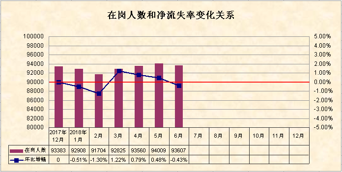 6月末全市监测企业岗位总人数有93607人,比上期企业岗位减少402人,环比减少0.43%。从表11的图表分析数据来看:企业在岗人数由2017年12月底建档期的93383人,减少到2月份春节期间最低的91704人,节后3-5月份期间在岗人数逐月回升到最高的94009人,6月份在岗人数环比略有小幅下降,但基本保持在9.3万人以上,反映企业目前的用工需求得以有效补充。