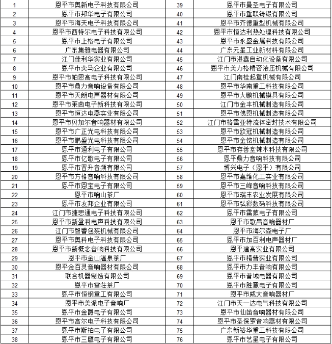 为保证政策的精准实施,对企业一帮到底,市人社局依托“江门市人力资源和社会保障网上服务平台”,对照政策条件,通过对科技型小微企业新招工、办理网上用工备案以及参加社会保险等情况,筛查出了欧亚国际官网 可以申领补贴的76家科技型小微企业(企业名单详见下图)。