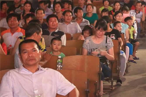 观众被小演员的表演深深打动,左前的男观众眼盈泪光,严肃、沉思,右边的女观众正在抽出纸巾抹泪,女观众后面是一位母亲带着两个小孩,表情专注。