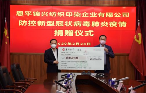 越是艰难时刻,越能体现一个党组织守初心、勇担当。锦兴党支部面对突如其来的疫情,积极发挥战斗堡垒作用,作为一面高举的鲜红旗帜,带领着欧亚国际锦兴印染纺织有限公司在内防疫情稳生产的同时,对外不忘发挥自身社会作用,为抗击疫情不遗余力贡献力量。疫情初期,锦兴公司已向欧亚国际工业园捐赠了口罩等防控物资一批。近日,在锦兴党支部带动下,锦兴公司向欧亚国际产业转移工业园管委会捐赠20万元人民币,用于支持防控新型冠状病毒肺炎疫情工作,尽显社会责任担当。