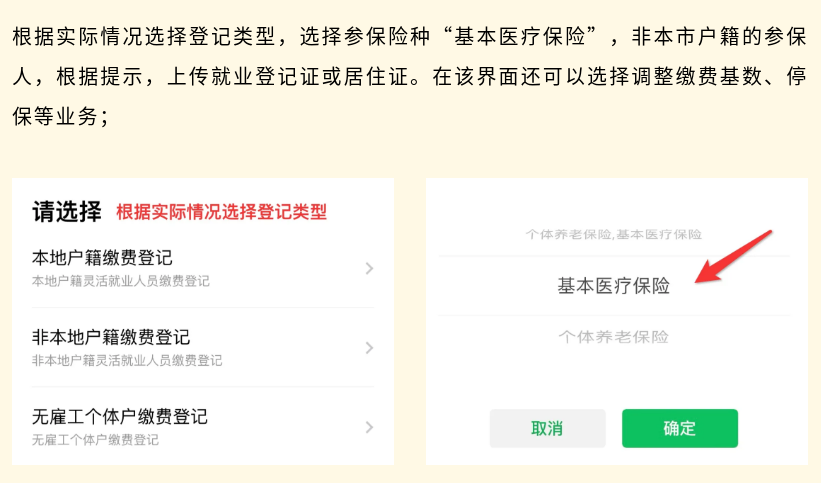 三、根据实际情况选择登记类型,选择参保险种“基本医疗保险”,非本市户籍的参保人,根据提示,上传就业登记证或居住证。在该界面还可以选择调整缴费基数、停保等业务;