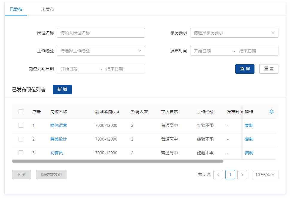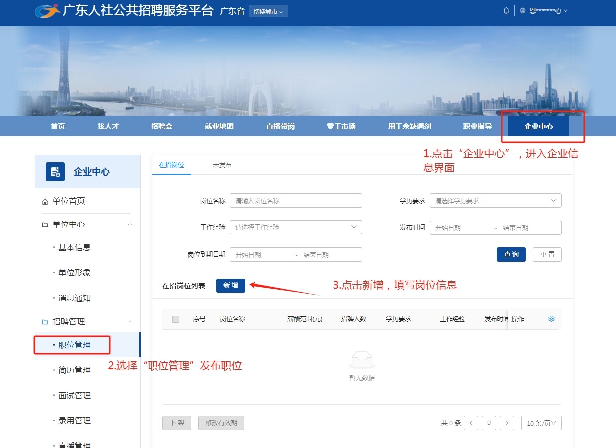 1.点击“企业中心”,进入企业信息界面,选择“招聘管理”模块,点击职位管理,进入岗位录入。