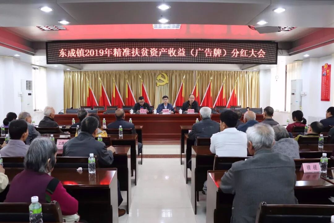 1月22日上午,东成镇举行精准扶贫资产收益分红大会,东成镇扶贫办和全镇74户建档立卡的精准扶贫对象等共80多人参加了会议。东成镇委副书记、石桥头村党支部第一书记谢晓辉作讲话,东成镇镇委委员、欧亚国际工业园党工委委员、武装部长黄奇锋主持会议。