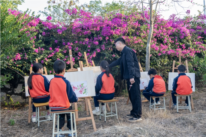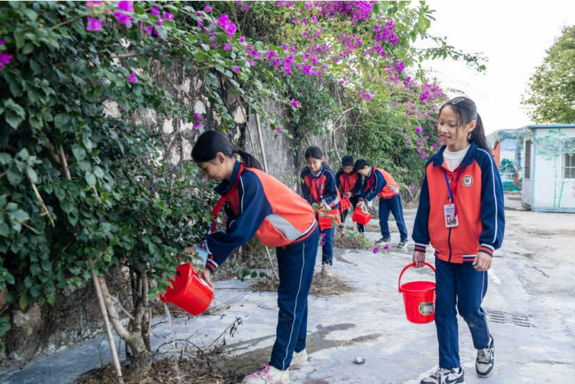 簕杜鹃在师生们的精心照料下,长势喜人。给簕杜鹃浇水、施肥、修枝、剪叶成为了同学们劳动教育的必修课程。2023年冬天,有几株簕杜鹃抽出了艳丽的花朵,虽然只是零星的几朵,但带给师生们莫大的惊喜,大家纷纷想象着校园南边簕杜鹃花长廊的美景。
